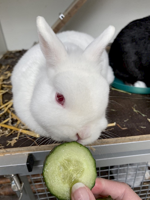 Snow en Charming zaten al een maand samen voordat ik ging proberen om ze te aaien. Als eerste begon ik met Snow een stukje groente geven. Die ging ze al heel snel aanpakken. Dit heb ik een paar dagen gedaan voordat ik een stapje verder ging. Snow naar me toe roepen en toen pas de groente geven. Ook tot dit weer een paar dagen goed ging ben ik weer een stapje verder gegaan. Snow roepen, aaien en daarna de groente geven.